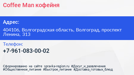 Coffee Man, кофейня по адресу 404106, Волгоградская область, Волгоград, проспект Ленина, 313 в дальнейшем Организация, размещена в следующих категориях: