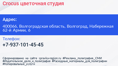 Crocus, цветочная студия по адресу 400066, Волгоградская область, Волгоград, Набережная 62-й Армии, 6 в дальнейшем Организация, размещена в следующих категориях: