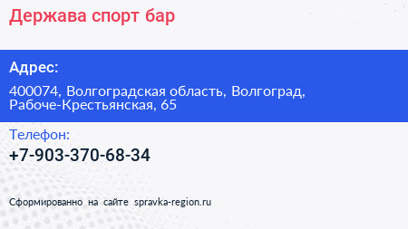 Держава, спорт-бар по адресу 400074, Волгоградская область, Волгоград, Рабоче-Крестьянская, 65 в дальнейшем Организация, размещена в следующих категориях: