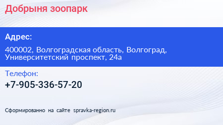 Добрыня, зоопарк по адресу 400002, Волгоградская область, Волгоград, Университетский проспект, 24а в дальнейшем Организация, размещена в следующих категориях:
