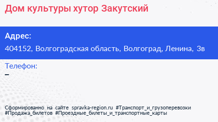 Дом культуры, хутор Закутский по адресу 404152, Волгоградская область, Волгоград, Ленина, 3в в дальнейшем Организация, размещена в следующих категориях: