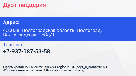 Дуэт, пиццерия по адресу 400038, Волгоградская область, Волгоград, Волгоградская, 168д/1 в дальнейшем Организация, размещена в следующих категориях: