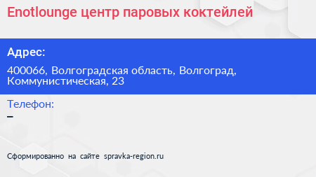 Enotlounge, центр паровых коктейлей по адресу 400066, Волгоградская область, Волгоград, Коммунистическая, 23 в дальнейшем Организация, размещена в следующих категориях: