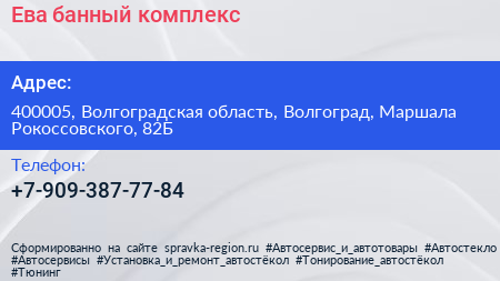 Ева, банный комплекс по адресу 400005, Волгоградская область, Волгоград, Маршала Рокоссовского, 82Б в дальнейшем Организация, размещена в следующих категориях: