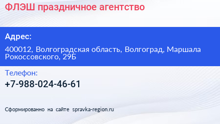 ФЛЭШ, праздничное агентство по адресу 400012, Волгоградская область, Волгоград, Маршала Рокоссовского, 29Б в дальнейшем Организация, размещена в следующих категориях:
