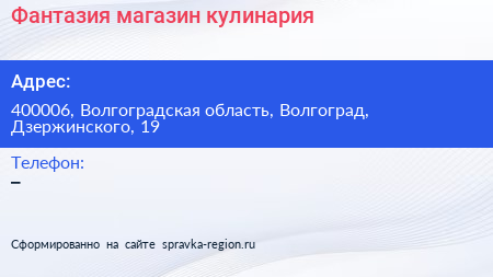 Фантазия, магазин-кулинария по адресу 400006, Волгоградская область, Волгоград, Дзержинского, 19 в дальнейшем Организация, размещена в следующих категориях: