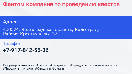 Фантом, компания по проведению квестов по адресу 400074, Волгоградская область, Волгоград, Рабоче-Крестьянская, 37 в дальнейшем Организация, размещена в следующих категориях: