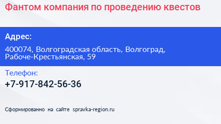 Фантом, компания по проведению квестов по адресу 400074, Волгоградская область, Волгоград, Рабоче-Крестьянская, 59 в дальнейшем Организация, размещена в следующих категориях: