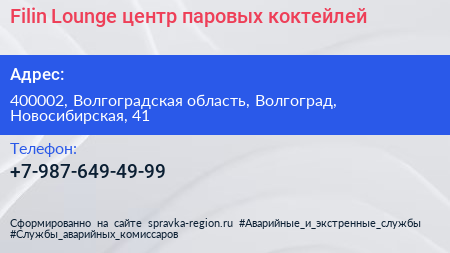 Filin-Lounge, центр паровых коктейлей по адресу 400002, Волгоградская область, Волгоград, Новосибирская, 41 в дальнейшем Организация, размещена в следующих категориях: