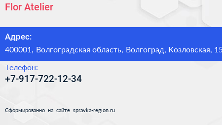 Flor Аtelier по адресу 400001, Волгоградская область, Волгоград, Козловская, 15 в дальнейшем Организация, размещена в следующих категориях:
