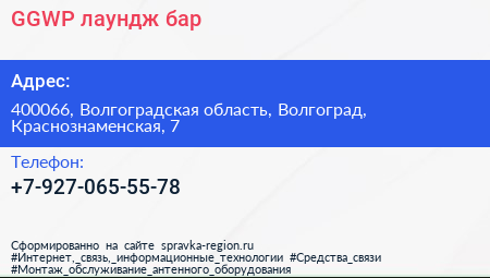 GGWP, лаундж-бар по адресу 400066, Волгоградская область, Волгоград, Краснознаменская, 7 в дальнейшем Организация, размещена в следующих категориях: