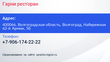 Гарни, ресторан по адресу 400066, Волгоградская область, Волгоград, Набережная 62-й Армии, 5Б в дальнейшем Организация, размещена в следующих категориях:
