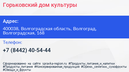 Горьковский, дом культуры по адресу 400038, Волгоградская область, Волгоград, Волгоградская, 168 в дальнейшем Организация, размещена в следующих категориях: