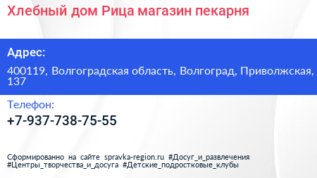 Хлебный дом Рица, магазин-пекарня по адресу 400119, Волгоградская область, Волгоград, Приволжская, 137 в дальнейшем Организация, размещена в следующих категориях: