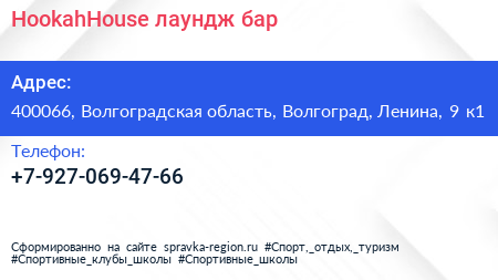 HookahHouse, лаундж-бар по адресу 400066, Волгоградская область, Волгоград, Ленина, 9 к1 в дальнейшем Организация, размещена в следующих категориях: