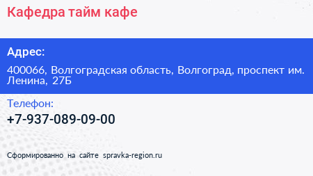Кафедра, тайм-кафе по адресу 400066, Волгоградская область, Волгоград, проспект им. Ленина, 27Б в дальнейшем Организация, размещена в следующих категориях:
