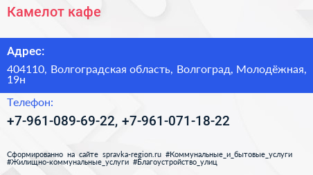 Камелот, кафе по адресу 404110, Волгоградская область, Волгоград, Молодёжная, 19н в дальнейшем Организация, размещена в следующих категориях: