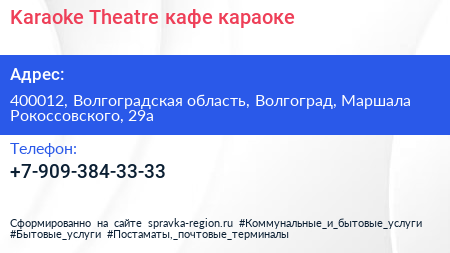 Karaoke-Theatre, кафе-караоке по адресу 400012, Волгоградская область, Волгоград, Маршала Рокоссовского, 29а в дальнейшем Организация, размещена в следующих категориях:
