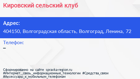 Кировский сельский клуб по адресу 404150, Волгоградская область, Волгоград, Ленина, 72 в дальнейшем Организация, размещена в следующих категориях: