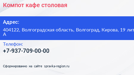 Компот, кафе-столовая по адресу 404122, Волгоградская область, Волгоград, Кирова, 19 лит А в дальнейшем Организация, размещена в следующих категориях: