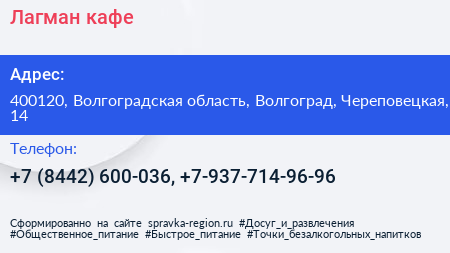 Лагман, кафе по адресу 400120, Волгоградская область, Волгоград, Череповецкая, 14 в дальнейшем Организация, размещена в следующих категориях: