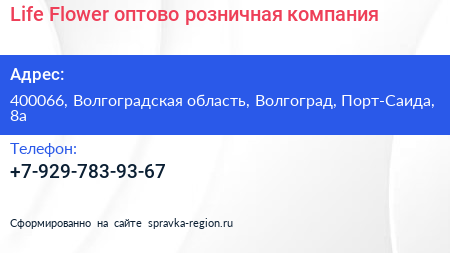 Life Flower, оптово-розничная компания по адресу 400066, Волгоградская область, Волгоград, Порт-Саида, 8а в дальнейшем Организация, размещена в следующих категориях: