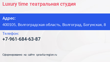 Luxury time, театральная студия по адресу 400105, Волгоградская область, Волгоград, Богунская, 8 в дальнейшем Организация, размещена в следующих категориях: