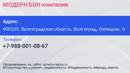 МОДЕРН-БОН, компания по адресу 400120, Волгоградская область, Волгоград, Липецкая, 6 в дальнейшем Организация, размещена в следующих категориях: