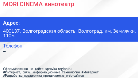 MORI CINEMA, кинотеатр по адресу 400137, Волгоградская область, Волгоград, им. Землячки, 110Б в дальнейшем Организация, размещена в следующих категориях: