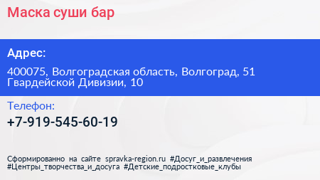 Маска, суши-бар по адресу 400075, Волгоградская область, Волгоград, 51 Гвардейской Дивизии, 10 в дальнейшем Организация, размещена в следующих категориях: