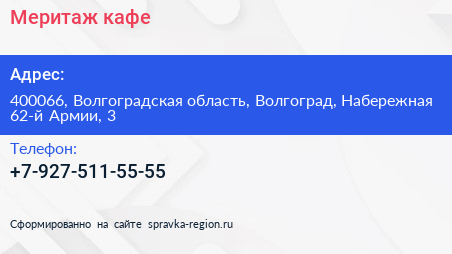 Меритаж, кафе по адресу 400066, Волгоградская область, Волгоград, Набережная 62-й Армии, 3 в дальнейшем Организация, размещена в следующих категориях: