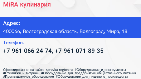 MiRA, кулинария по адресу 400066, Волгоградская область, Волгоград, Мира, 18 в дальнейшем Организация, размещена в следующих категориях: