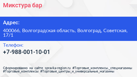 Микстура, бар по адресу 400066, Волгоградская область, Волгоград, Советская, 17/1 в дальнейшем Организация, размещена в следующих категориях: