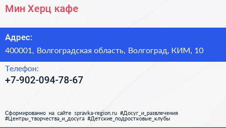 Мин Херц, кафе по адресу 400001, Волгоградская область, Волгоград, КИМ, 10 в дальнейшем Организация, размещена в следующих категориях: