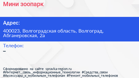 Мини-зоопарк по адресу 400023, Волгоградская область, Волгоград, Абганеровская, 2а в дальнейшем Организация, размещена в следующих категориях: