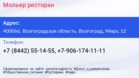Мольер, ресторан по адресу 400066, Волгоградская область, Волгоград, Мира, 12 в дальнейшем Организация, размещена в следующих категориях: