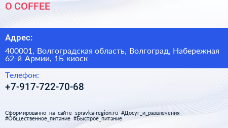 O!COFFEE по адресу 400001, Волгоградская область, Волгоград, Набережная 62-й Армии, 1Б киоск в дальнейшем Организация, размещена в следующих категориях: