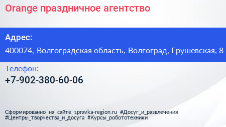 Orange, праздничное агентство по адресу 400074, Волгоградская область, Волгоград, Грушевская, 8 в дальнейшем Организация, размещена в следующих категориях: