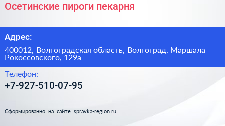 Осетинские пироги, пекарня по адресу 400012, Волгоградская область, Волгоград, Маршала Рокоссовского, 129а в дальнейшем Организация, размещена в следующих категориях: