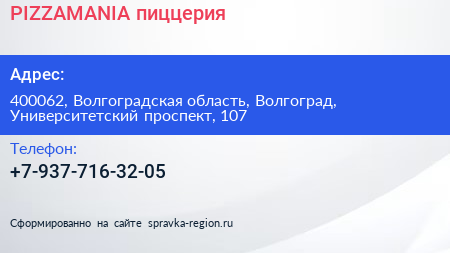 PIZZAMANIA, пиццерия по адресу 400062, Волгоградская область, Волгоград, Университетский проспект, 107 в дальнейшем Организация, размещена в следующих категориях: