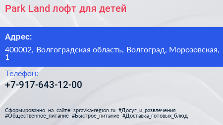 Park Land, лофт для детей по адресу 400002, Волгоградская область, Волгоград, Морозовская, 1 в дальнейшем Организация, размещена в следующих категориях: