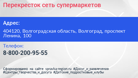 Перекресток, сеть супермаркетов по адресу 404120, Волгоградская область, Волгоград, проспект Ленина, 100 в дальнейшем Организация, размещена в следующих категориях: