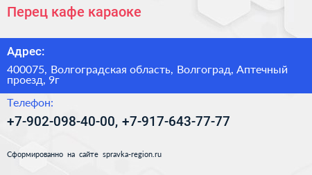 Перец, кафе-караоке по адресу 400075, Волгоградская область, Волгоград, Аптечный проезд, 9г в дальнейшем Организация, размещена в следующих категориях:
