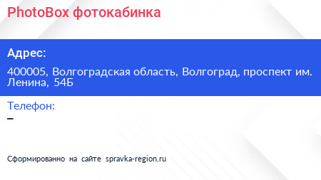 PhotoBox, фотокабинка по адресу 400005, Волгоградская область, Волгоград, проспект им. Ленина, 54Б в дальнейшем Организация, размещена в следующих категориях:
