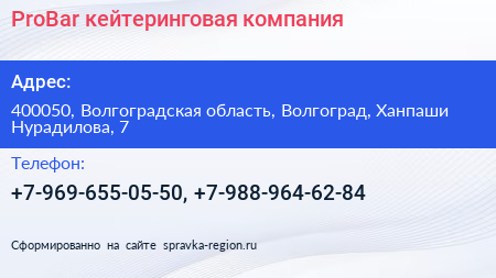 ProBar, кейтеринговая компания по адресу 400050, Волгоградская область, Волгоград, Ханпаши Нурадилова, 7 в дальнейшем Организация, размещена в следующих категориях: