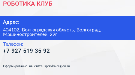 РОБОТИКА-КЛУБ по адресу 404102, Волгоградская область, Волгоград, Машиностроителей, 29г в дальнейшем Организация, размещена в следующих категориях:
