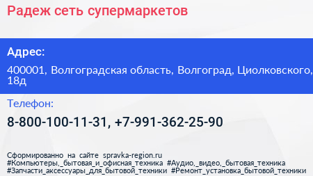 Радеж, сеть супермаркетов по адресу 400001, Волгоградская область, Волгоград, Циолковского, 18д в дальнейшем Организация, размещена в следующих категориях: