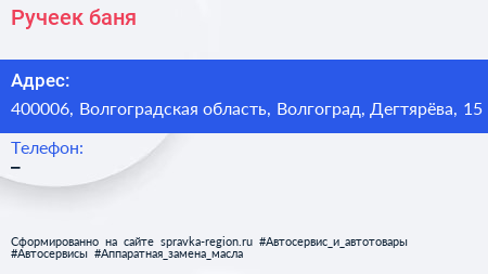 Ручеек, баня по адресу 400006, Волгоградская область, Волгоград, Дегтярёва, 15 в дальнейшем Организация, размещена в следующих категориях:
