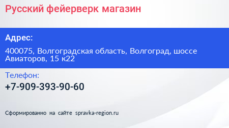 Русский фейерверк, магазин по адресу 400075, Волгоградская область, Волгоград, шоссе Авиаторов, 15 к22 в дальнейшем Организация, размещена в следующих категориях: