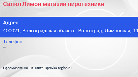 СалютЛимон, магазин пиротехники по адресу 400021, Волгоградская область, Волгоград, Лимоновая, 11 в дальнейшем Организация, размещена в следующих категориях:
